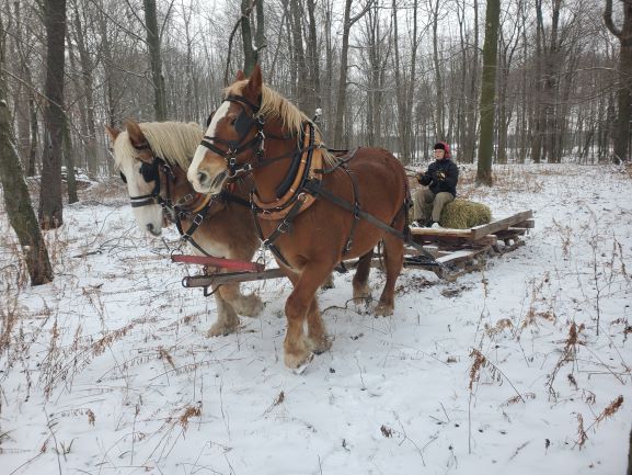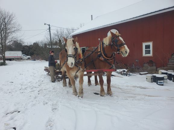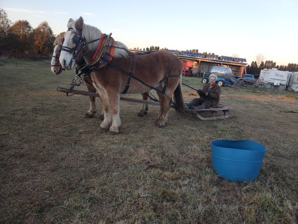 Arriving at the south barn and the horses want some oats after an hour of puling the sled.