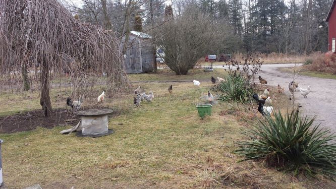 The fines are really high in protein (about 30 to 35%) as well as lots of omega 3 and 9. When egg production exceeds sales, I also feed then some eggs cooked in their breakfast, which are high in methionine, which is an amino acid hard to find, but essential to chickens' health. They also get dried, ground up egg shells, which my egg customers save for us, mixed with oyster shell calcium, as a supplement. And of course, scraps left over from meals- meat, grains, fruit, vegetables, and I feel like a pied piper when I bring out their mid day treat. The compost pile seems to be a favourite  place to eat, but the garden is off limits during growing season. Those young plants, and luscious tomatoes seem to be irresistible. And anything with straw around it is fair game for scratching. It would be nice if they only stuck to the bugs I don't want in the garden, and leave the rest.