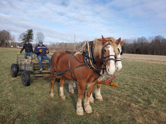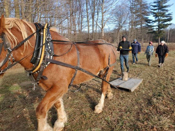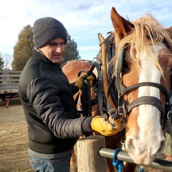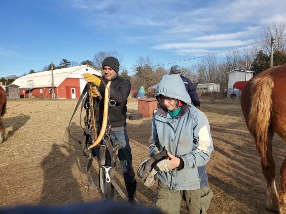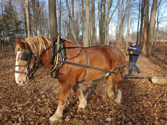 Ali driving Duke so we can get Duke to pull some logs for us.