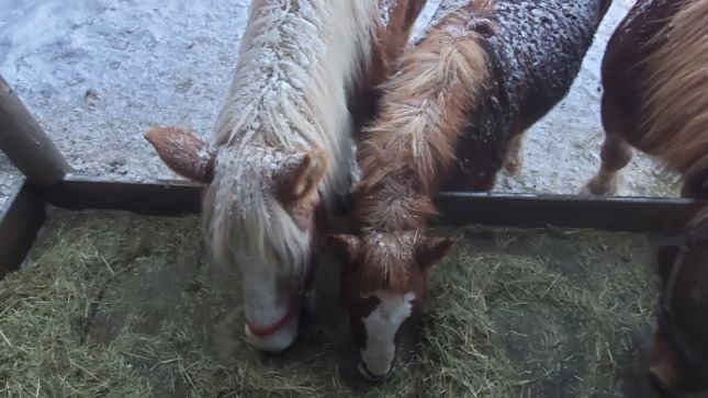 Jim and Sorrel friends again eating chopped hay |