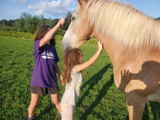 August 21, 2024. Pearl and Ester brushing Jim. |