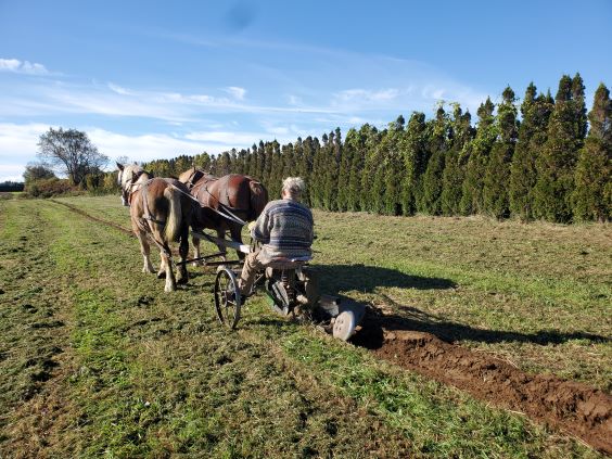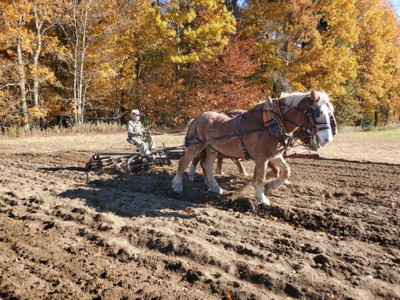 Oct 8 2024. Time to get the horses out and start plowing. I am just starting the plowing. Both the horses and myself take a little time to get a straight line and I feel rusty at the reins too. WE are oping this will be a camelina field but as with last year the very variable weather may make this not possible. |